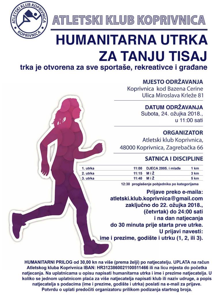 Atletski klub Koprivnica 24.03.2018. godine na lokaciji pored koprivničkog bazena Cerine (Ulica Mirsolava Krleže 81, Koprivnica) organizira humanitarnu kros utrsku na kojoj će biti prikupljena novčana sredstva za liječenje naše sugrađanke i bivše atletičarke Tanje Tisaj koja je prije godinu dana prilikom pada s bicikla zadobila teške ozljede i jošuvijek se nalazi u bolnici u teškom zdravstvenom stanju.